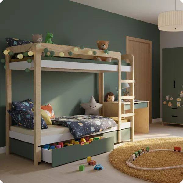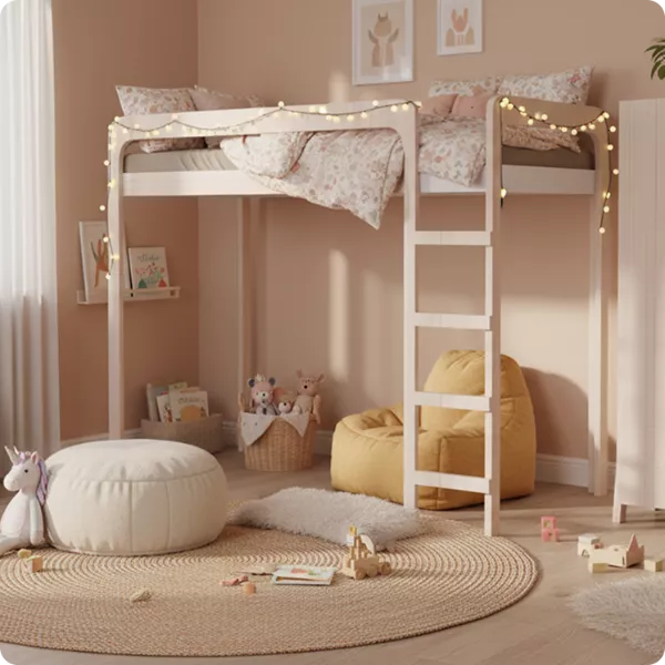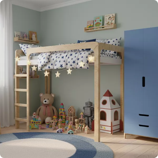 Funkcjonalne łóżko z antresolą, które łączy strefę snu z przestrzenią do nauki lub zabawy. Pozwala w pełni wykorzystać wysokość pokoju, tworząc przytulny i kreatywny kącik.