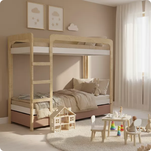 Nowoczesne łóżko piętrowe zaprojektowane z myślą o rodzeństwie lub małych przestrzeniach. Stabilna konstrukcja i wygodne schodki zapewniają komfort i bezpieczeństwo każdego dnia.